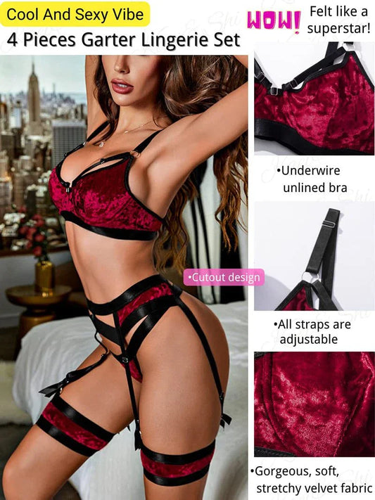 Lingerie con giarrettiera per donna, lingerie sexy in pizzo, set di lingerie coordinata trasparente da 4 pezzi